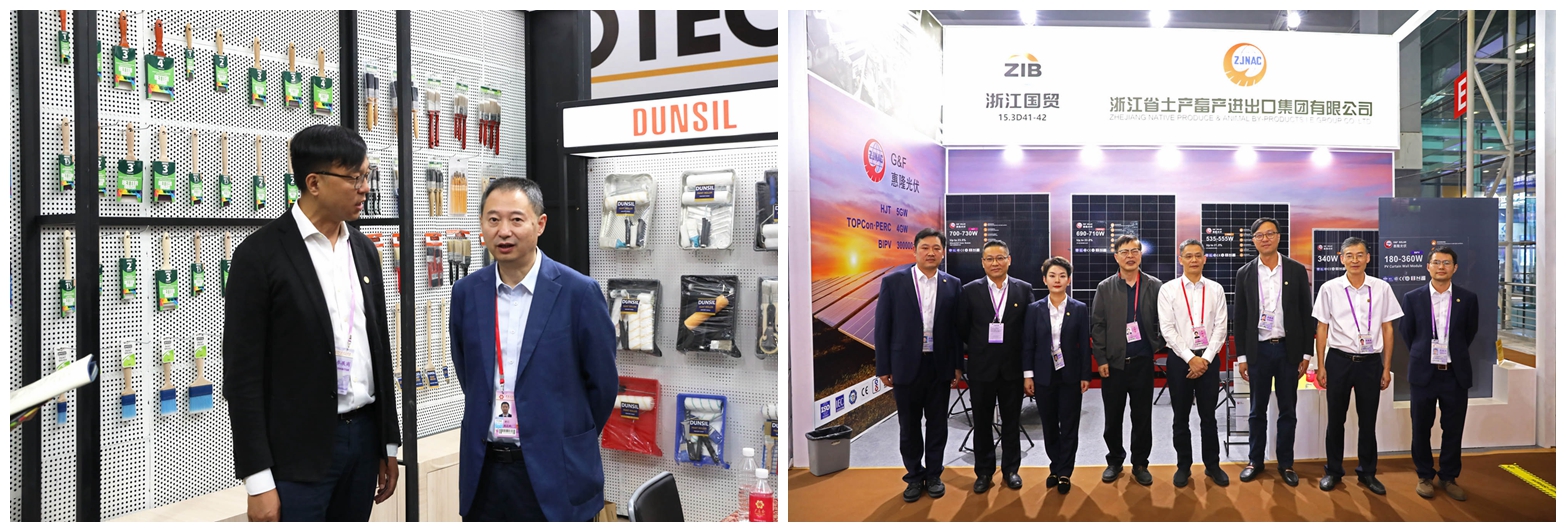 本屆廣交會浙江土畜共組織142個展位,160余名業(yè)務(wù)員參展,占浙江省交易團國貿(mào)分團近一半規(guī)模,創(chuàng)下新高,參展展品涵蓋五金工具、新能源、汽配、家居、旅游戶外、餐廚、服裝、家紡、箱包、鞋、食品等一、二、三期展會17個展區(qū)。